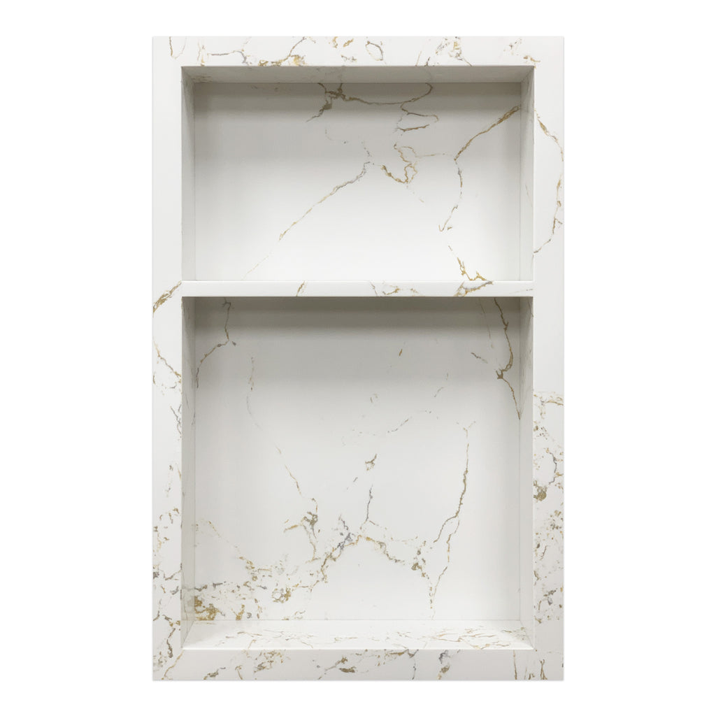 Upgrade your shower with the 15x24 Calacatta Gold Engineered Stone Shower Niche. This durable, waterproof niche features two spacious shelves for easy organization and boasts an elegant Calacatta Gold finish that suits both classic and modern bathrooms.